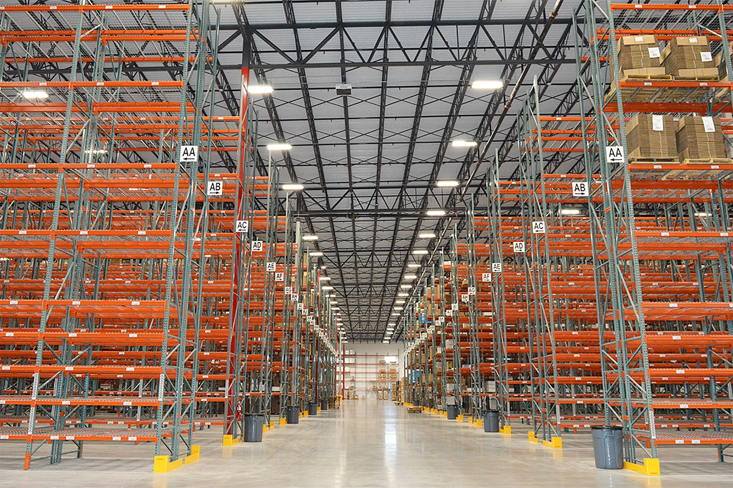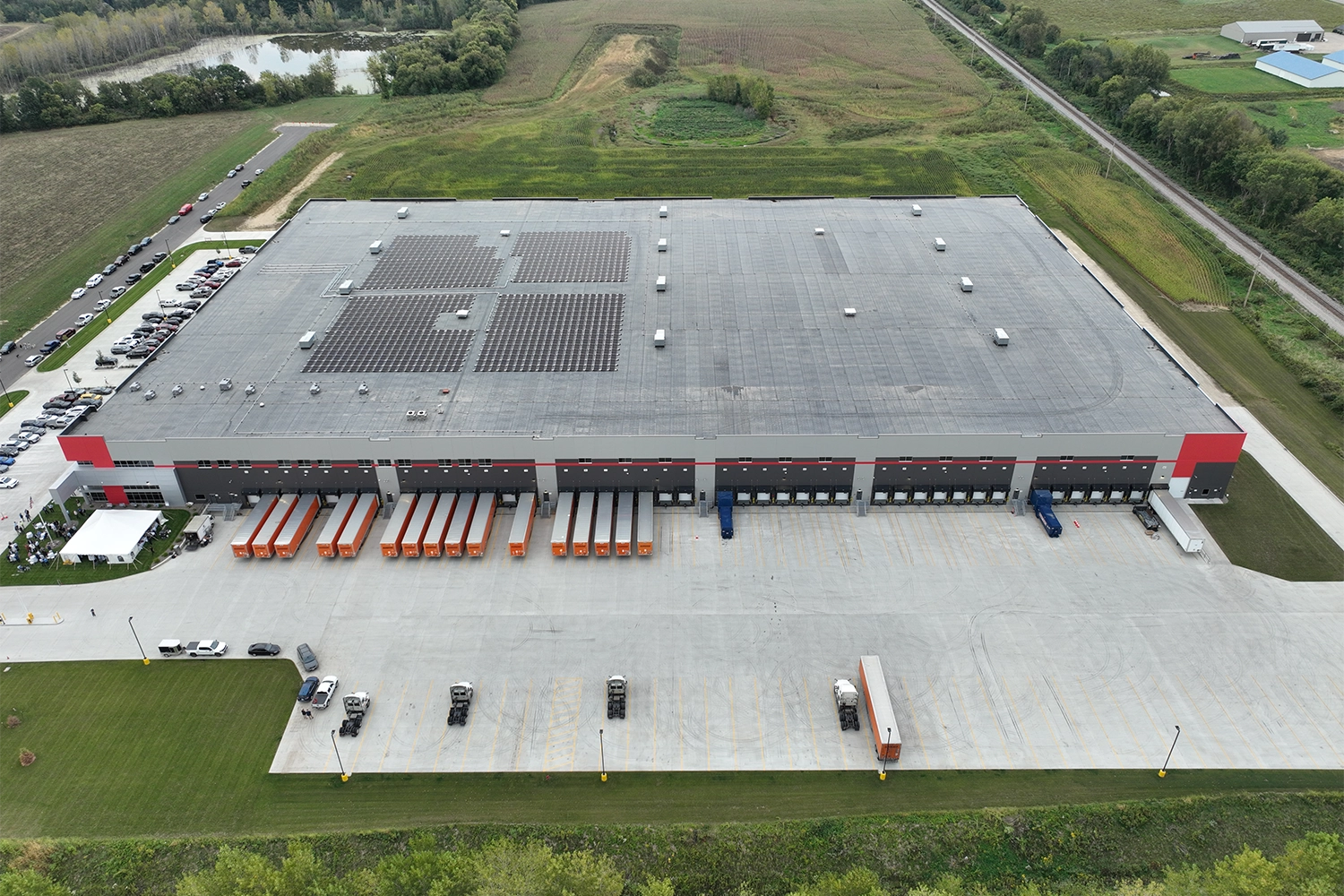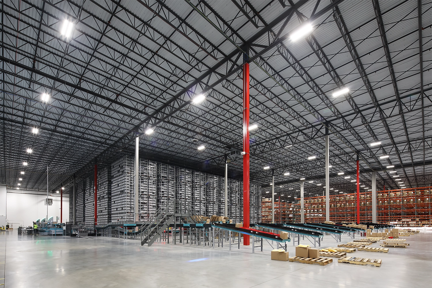 Working closely with First Supply’s leadership and operations teams, we coordinated planning around automation integration, material flow, and storage strategy to align the facility with real-world warehouse operations. The distribution center integrates advanced material handling, data-driven inventory management, and resilient building systems to support efficient, high-volume throughput, including an Exotec automated storage and retrieval system capable of housing over 52,000 totes supported by 31 autonomous robots. Additional storage solutions include 12,700 selective pallet racking locations and a dedicated bulk storage area accommodating more than 3,000 pallets for high-velocity, large-format inventory. Cubiscan technology captures precise weights and dimensions for every incoming product, enabling data-driven business rules that guide accurate storage and transportation decisions. Sustainability and operational continuity were also prioritized through on-site solar panels generating approximately 50% of daily energy needs, generator backup capable of powering the facility for up to 12 hours without refueling, and autonomous after-hours floor cleaning via an automated sweeper scrubber, creating a highly efficient, resilient, and future-ready distribution environment.