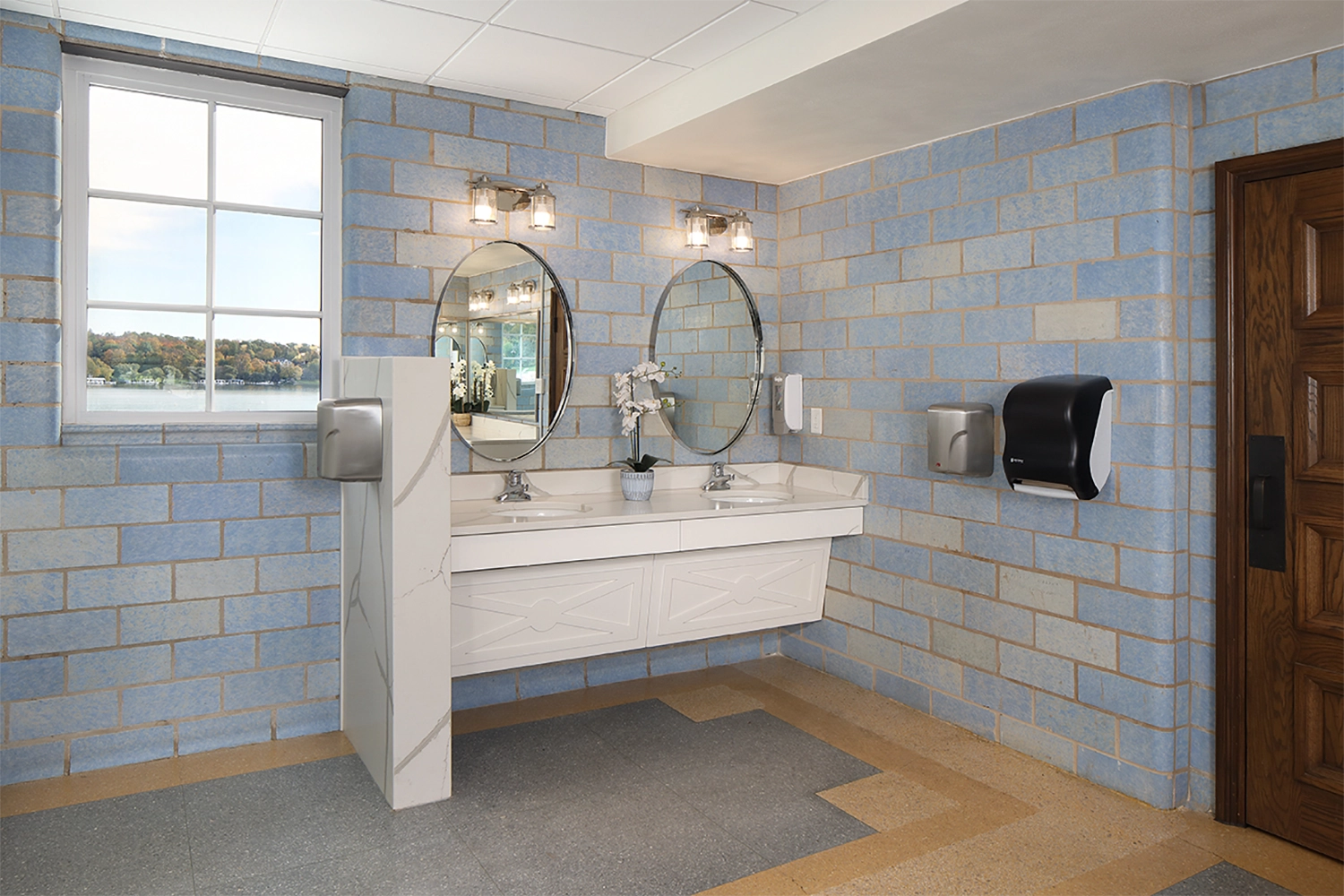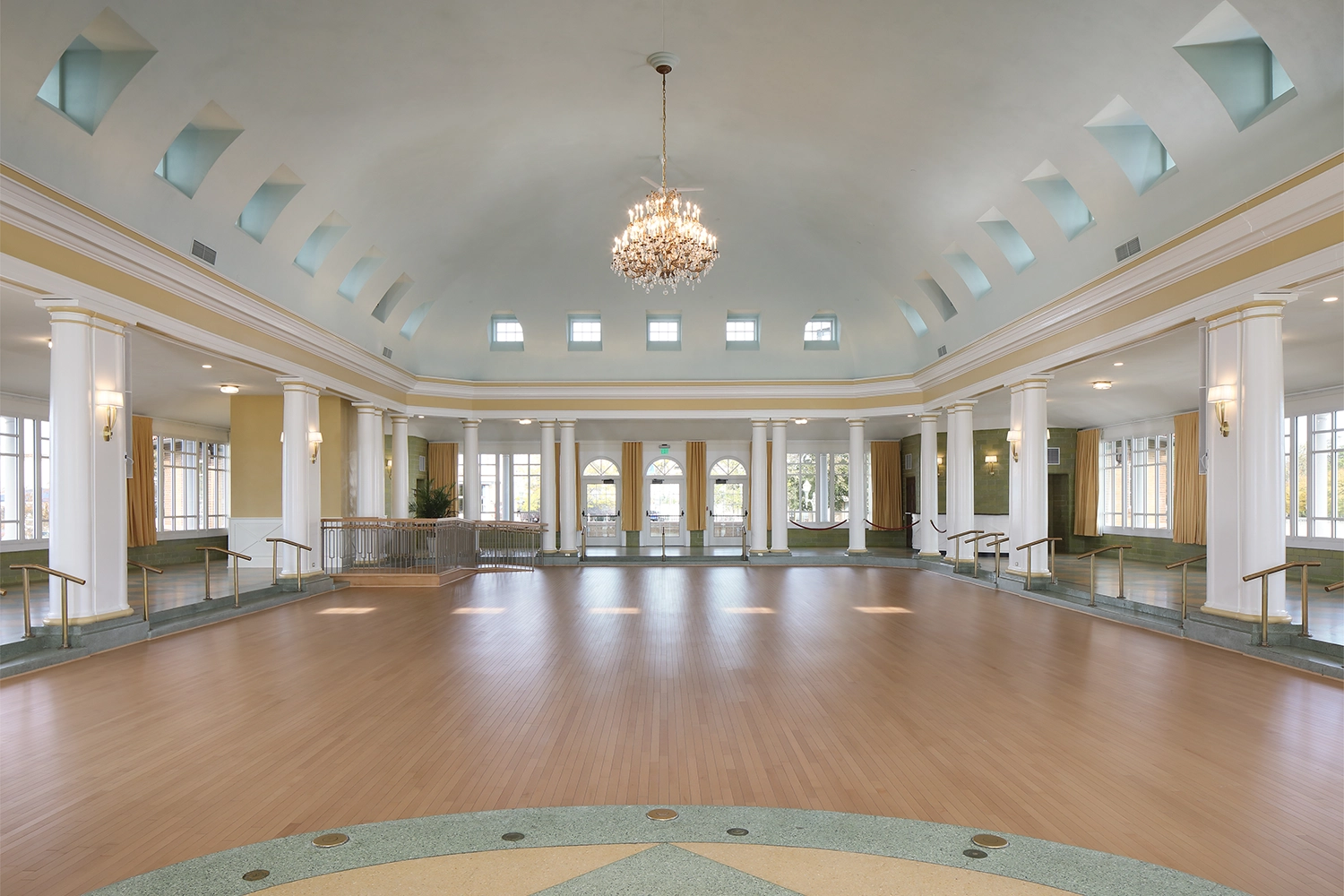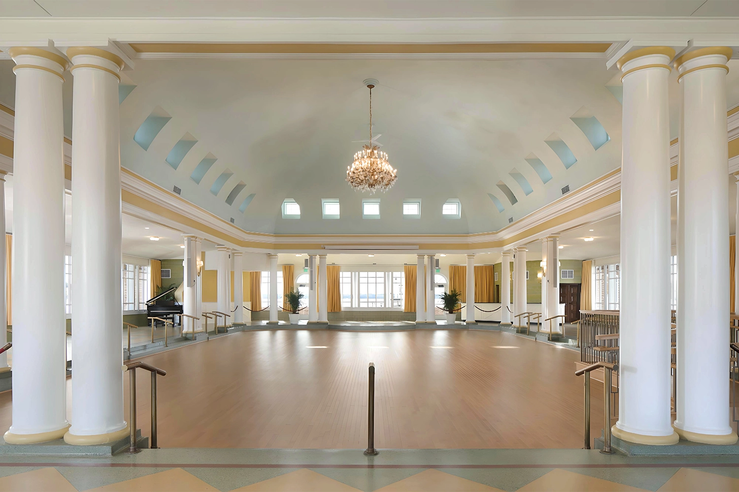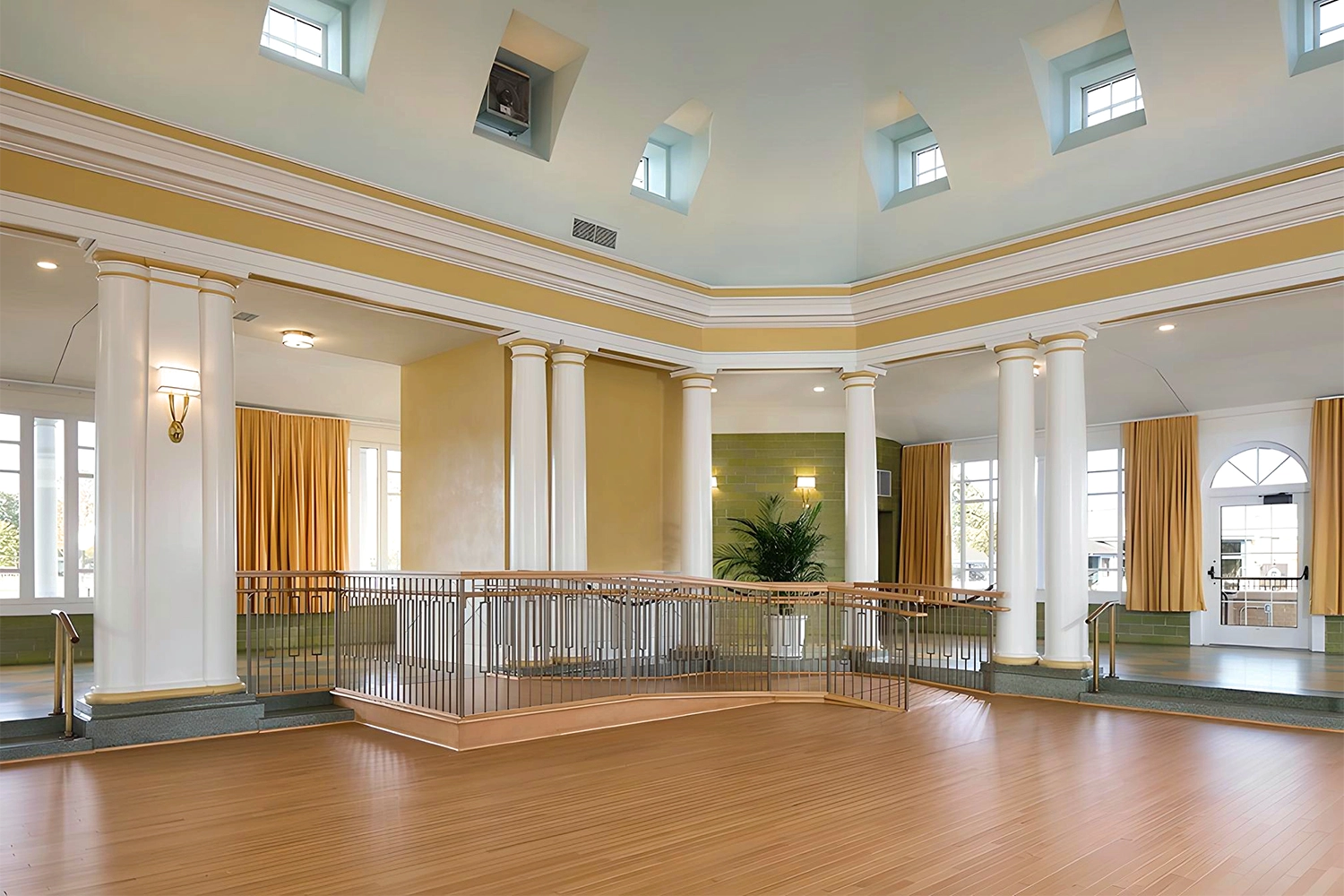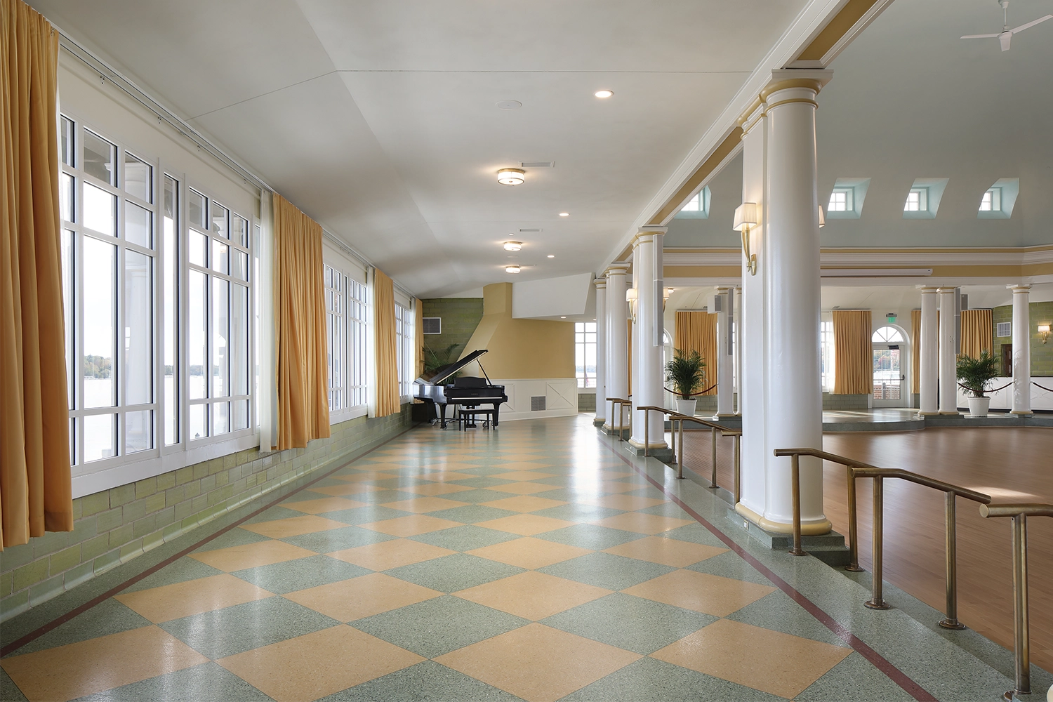 Phase I focused on stabilizing and protecting the building envelope, including replacement of the clay tile roof, second floor, and clerestory windows, and extensive masonry restoration. Phase II concentrated on interior and site enhancements, with renovations to the ballroom, concession area, boathouse, and boat launch. Interior upgrades included new central air conditioning and an energy-efficient furnace, sprinkler, security, and audiovisual systems, restored chandeliers and sconces, a new maple dance floor, custom bar and reception desk, new wood doors and windows, and replacement of dropped ceilings with traditional plaster. Accessibility improvements, such as an elevator and accessible ramp, ensured the venue could continue to serve a broad range of guests year-round.