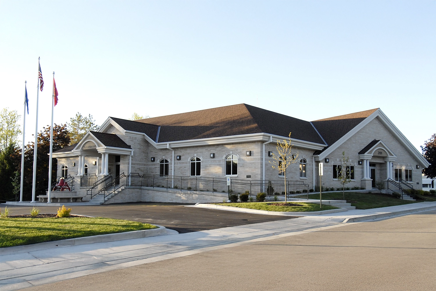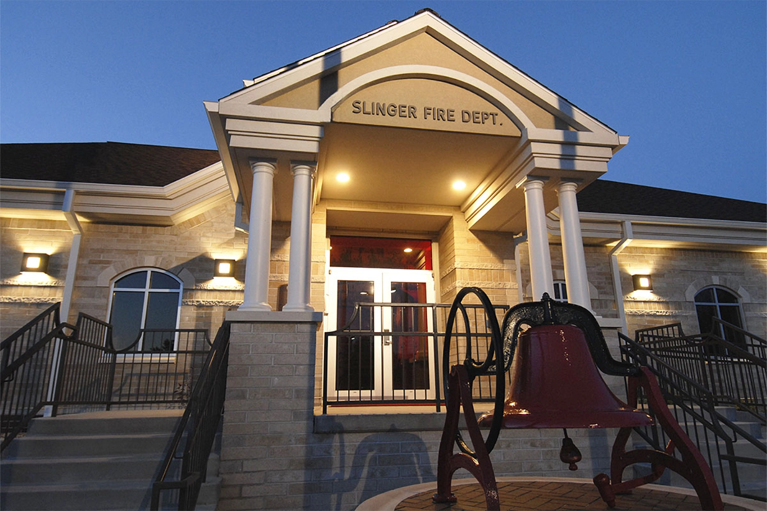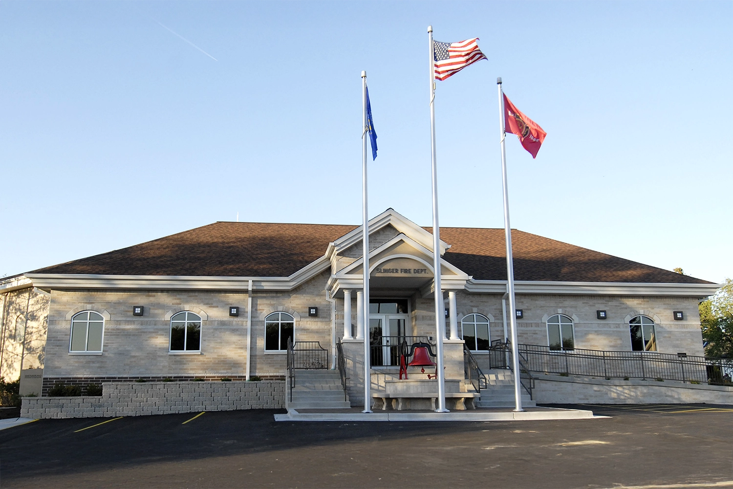 The Slinger Fire Department project features a thoughtfully designed addition that enhances both functionality and visual appeal. Classic architectural elements, including column entries, arched windows, and an elevated main entry, give the new space a timeless and distinguished presence. This addition not only supports the operational needs of the fire department but also complements the existing structure.