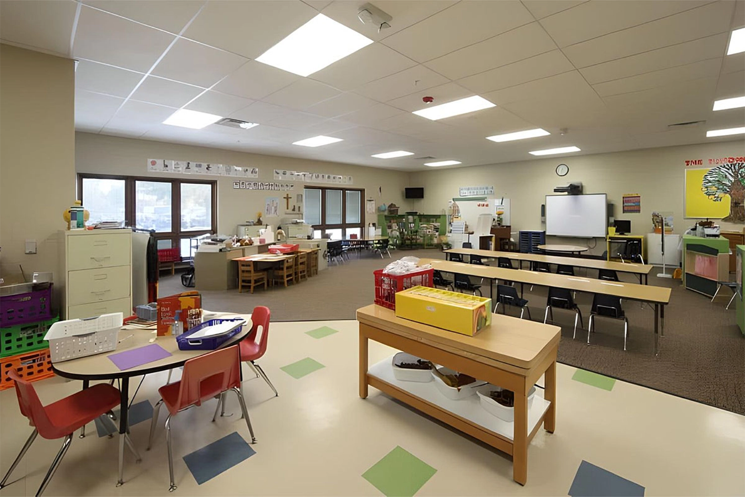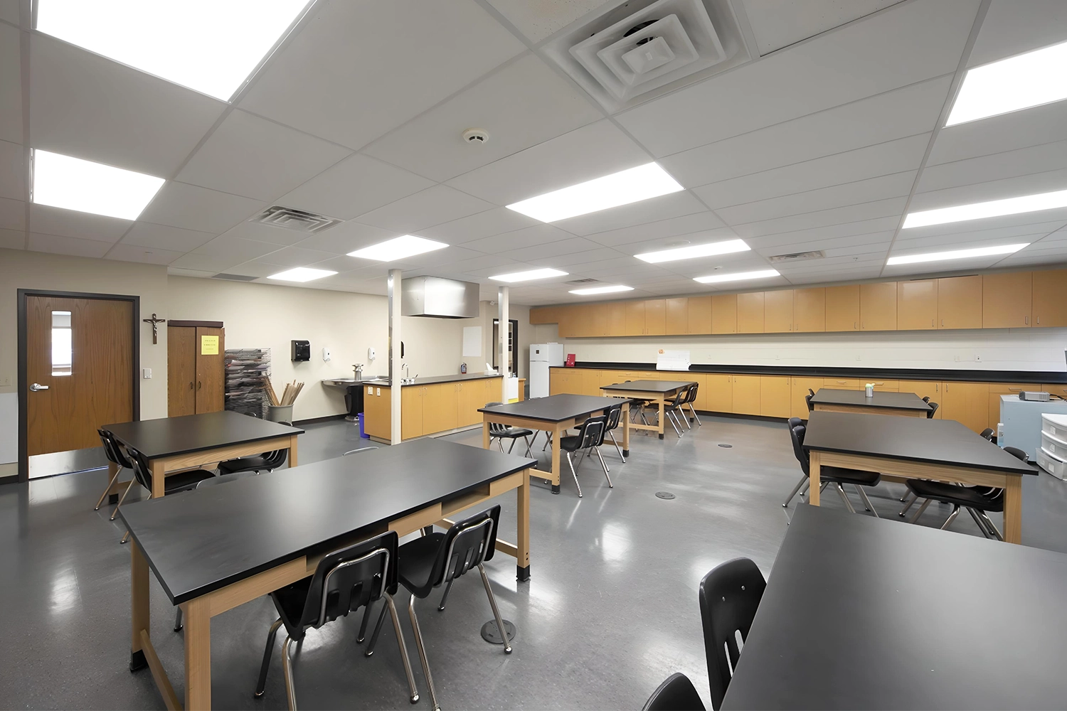 Collaboration and foresight guided each phase of the project. Phase One introduced a significant addition of a new parish activity center and gym, along with a dedicated music room and science lab, expanding both academic and community programming capacity. A subsequent addition unified the parish and school offices into a single administrative hub, establishing a clearly defined, controlled entrance that improved security, circulation, and daily operations. In Phase Two, former office, conference, and gathering spaces were renovated to support more flexible and collaborative use.